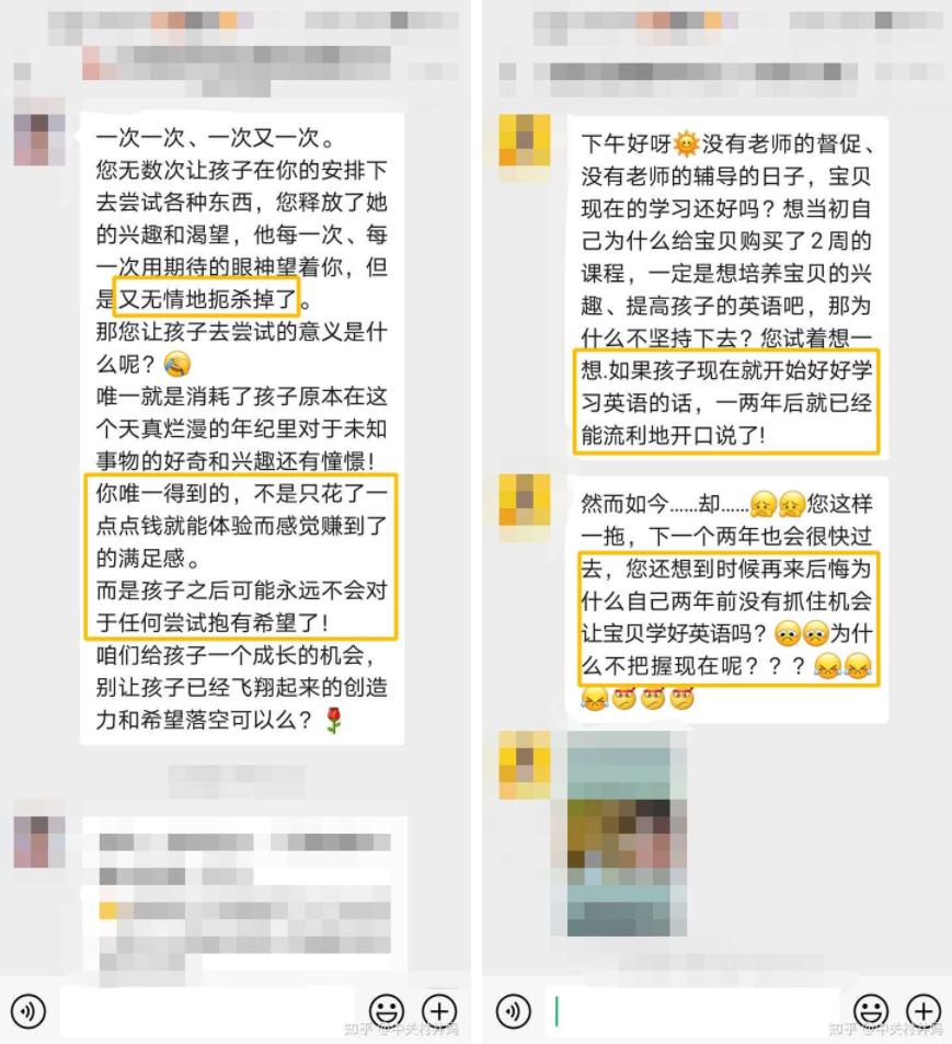 此外,文婷曾收到辅导老师的私信:“同龄的宝贝已经开始学习,走在了前面。”此话言外之意是,如果文婷不报名,就会让孩子落后。张茹也收到了类似的私信:“不希望您的孩子被落下”、“我说这么多,我是怕您错过这个提升孩子成绩的机会!”还有辅导老师“训斥”家长:“学习永远不是亡羊补牢的事情,难道要孩子一直追着别人跑吗?”