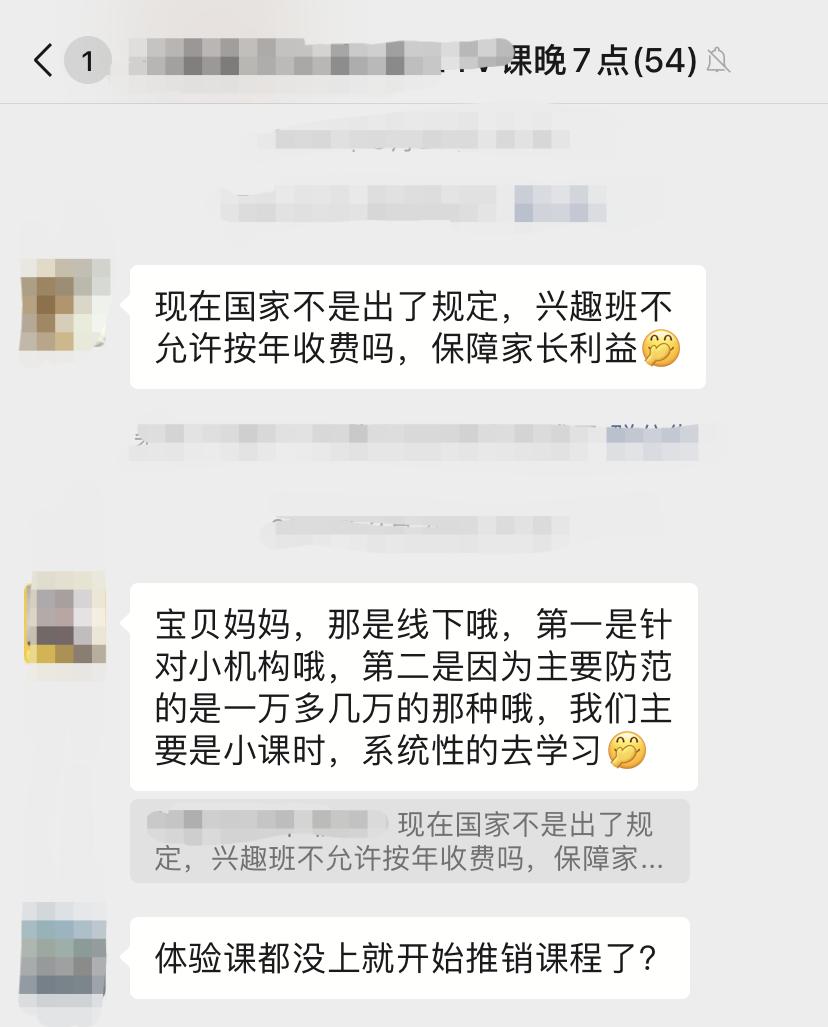 最让家长不放心的是,一些辅导老师在专业性方面还有待加强 。比如,文婷所在的美术体验课程家长群内,有家长问及:“现在国家不是出了规定,兴趣班不允许按年收费,保障家长利益?”该课程老师表示,这个规定一来是针对线下机构,二来主要是防范几万元的大额课程。