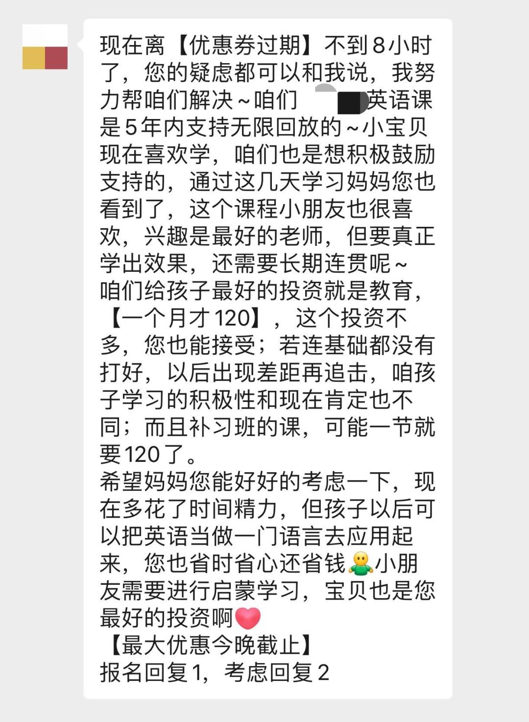 而事实证明,无论是折扣限时,还是少量的优惠名额,都是套路 。因为直到体验课的最后一天,这位老师依旧能申请到优惠名额,并私信轰炸文婷劝她报课。