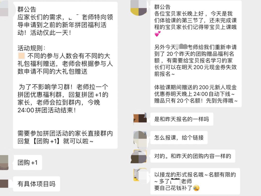 文婷还怀疑群内报名接龙的真实性。她认为,那些在群里带节奏的讨论,可能出自一些机构的“托儿”之手,和辅导老师一唱一和,引导家长们消费。