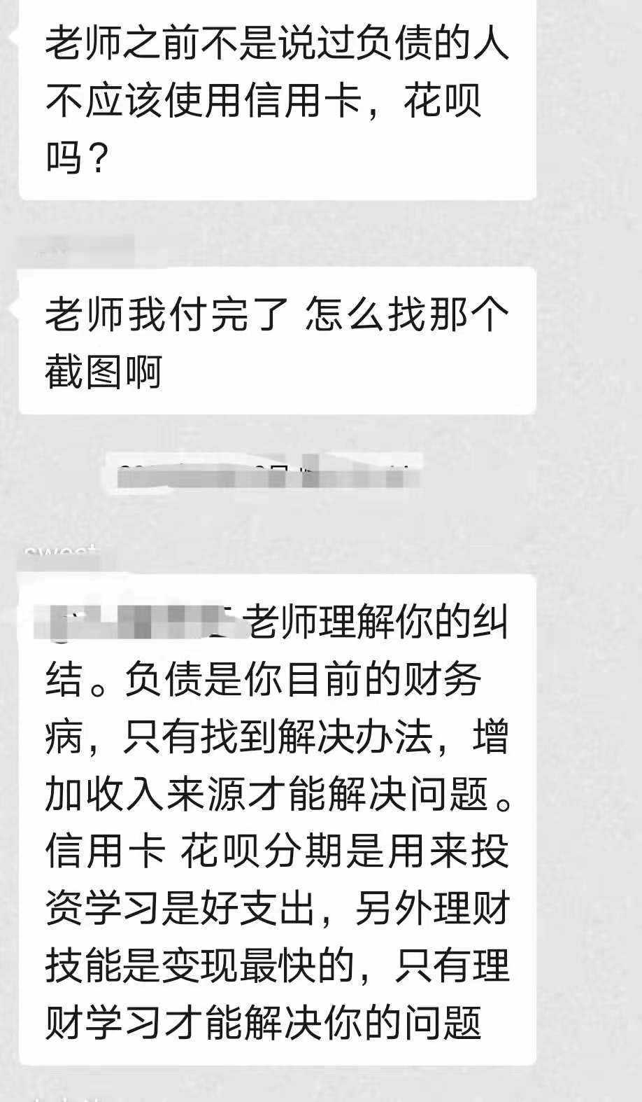 教育贷一直在延续着,并且渠道和形式越来越多样。在张茹体验的一个9块9在线财商课程的群里,有人提出质疑:“不是负债的人不应该使用信用卡、花呗吗?”但老师却劝学生不要纠结:“负债是你目前的财务病,只有找到解决办法,增加收入来源才能解决问题。信用卡、花呗分期是用来投资学习的,是好支出,另外理财技能是变现最快的,只有理财学习才能解决你的问题。”