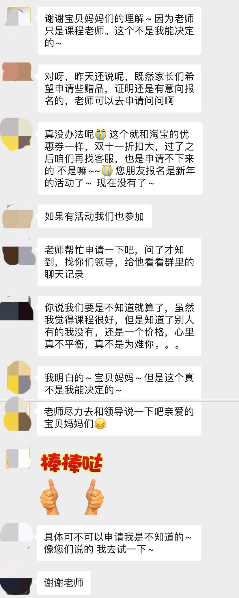 在群里,辅导老师经常会给家长传递“优惠难得”的信息。当体验课上到半程,有家长问,一年课程太长,能不能买半年课程时,老师表示,公司在获得新一轮融资之后,领投的投资机构要求不能卖半年课。不过在部分家长的“强烈要求”下,辅导老师称还是找领导特批了少量名额的半年课。