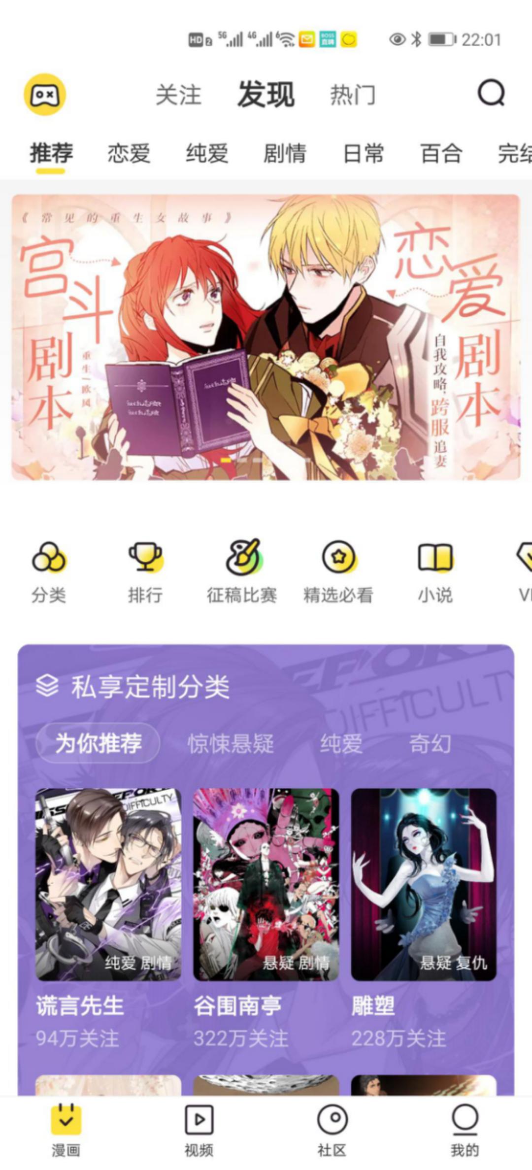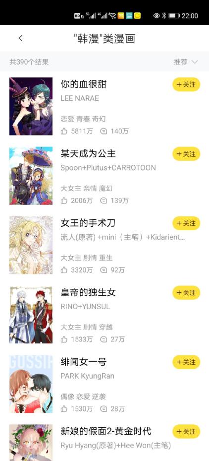 目前,快看漫画拥有的韩漫版权就并不少。在快看平台搜索韩漫,共有390个结果。其中《你的血很甜》807万人关注,《某天成为公主》有489万人关注。参考快看近两年最火的国漫IP之一《古围南亭》的322万关注人数可以发现,韩漫的关注人数并不低。
