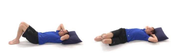 提示:10-15次/边。仰卧,膝盖弯曲到大约90度。接下来,把手举到脑后,慢慢地左右摆动膝盖。开始时动作范围要小一些,在热身时逐渐增加每次重复的时间长度。这是对背部和骨盆一个很好的运动的方式。