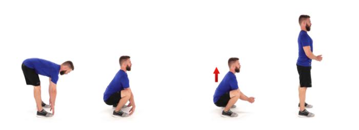 提示:10-15个动作。开始时髋部交叉,手臂垂向地面。如果你摸不到你的脚趾,不要担心,尽你最大的努力。下一个蹲下,弯曲膝盖,放下臀部,抬起胸部/头部。在深蹲的底部休息一到两秒钟,然后伸展到站立的姿势。