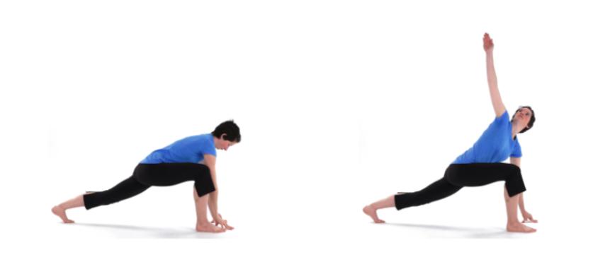 提示:每边重复5次。从俯卧撑的姿势开始。一只脚向前一步,把另一只手放在它旁边。接下来,将另一只手臂垂直扇动五次,然后换一边。用拇指跟踪你的眼睛,鼓励脖子转动。慢慢来——每个动作大约需要3秒钟来完成。