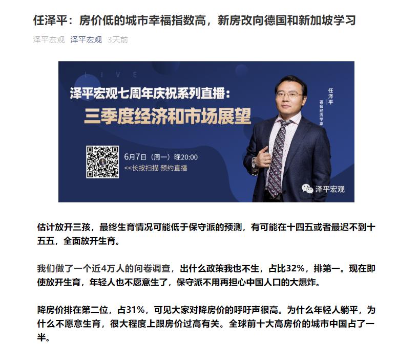 “房价低的城市幸福指数高。现在长沙是中国的第一大网红城市,已经超过成都、杭州这些地方了,老百姓的幸福指数特别高。”这是著名经济学家任泽平博士,在6月4日线上直播中,围绕“躺平、三孩、房价”的话题,分享的精彩观点之一。
