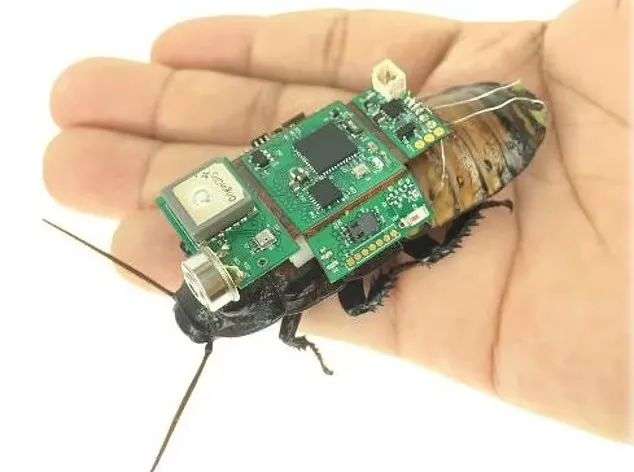 作为替代解决方案,他们开发了一种计算机和生物混合体,即这种半机械蟑螂,把微控制器和摄像头连接到蟑螂背部。