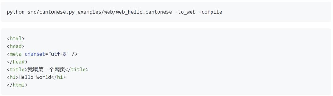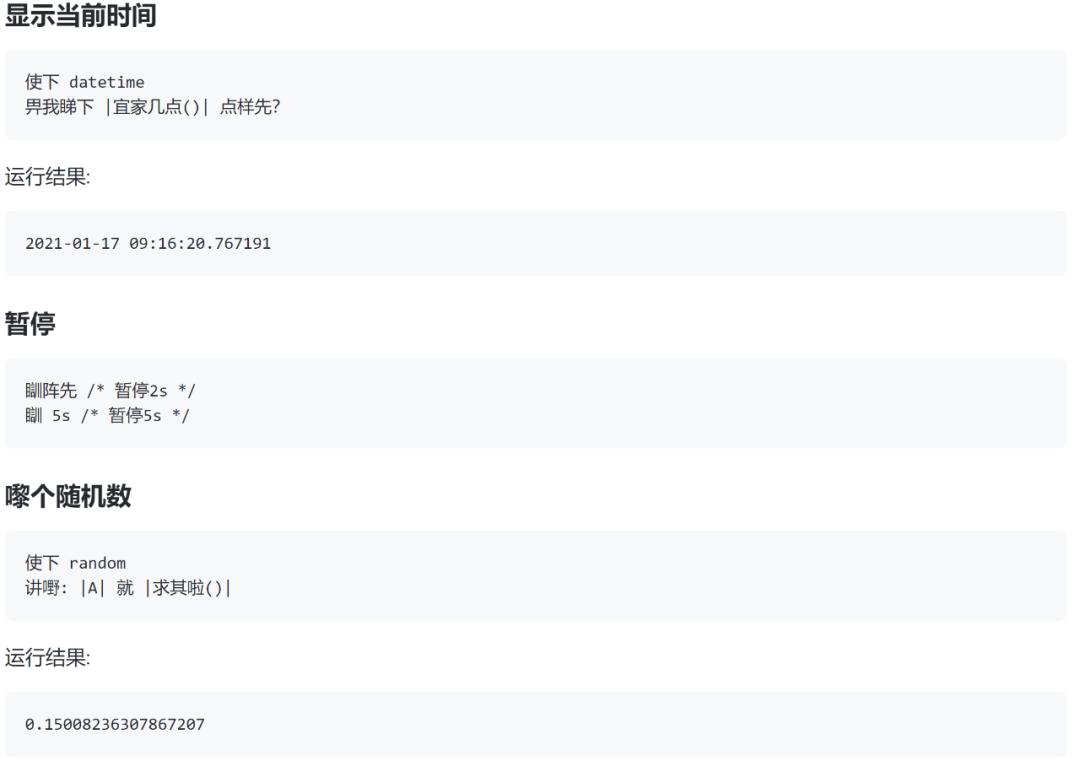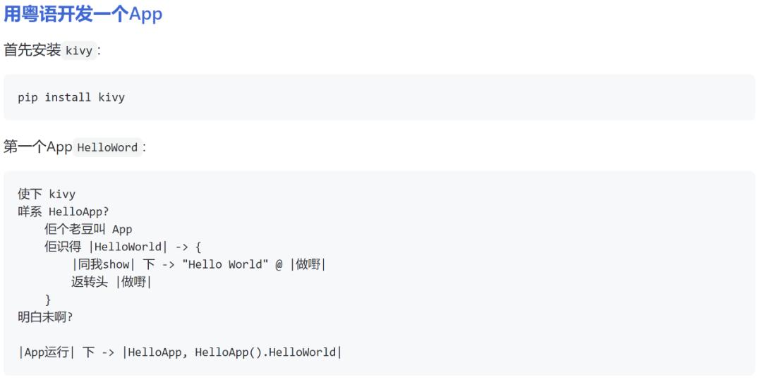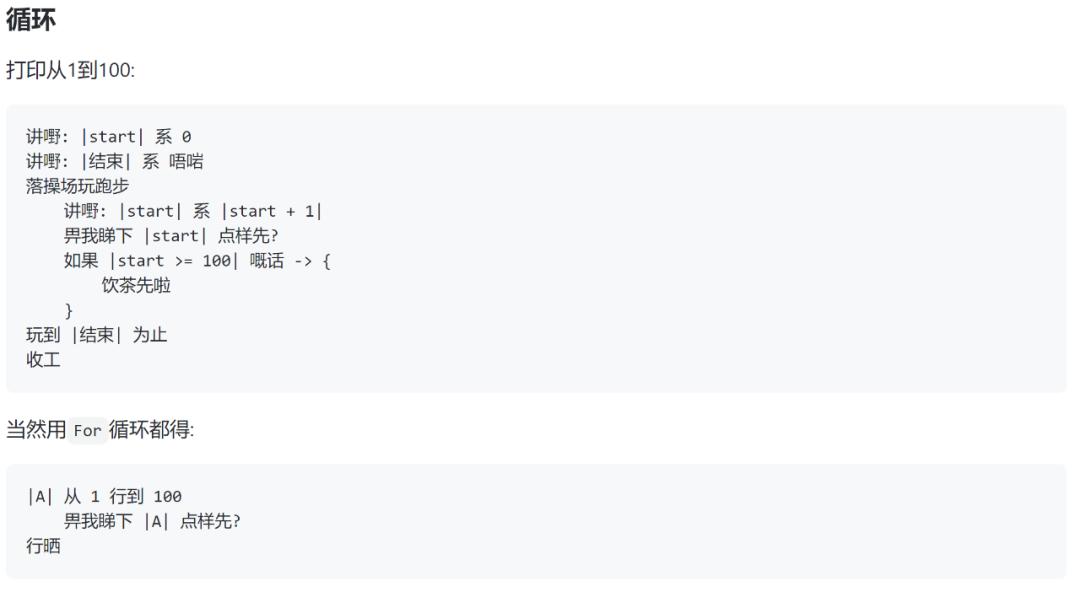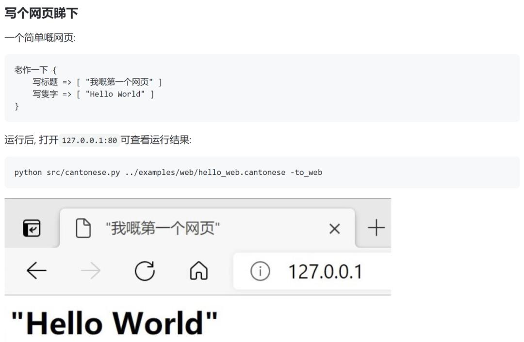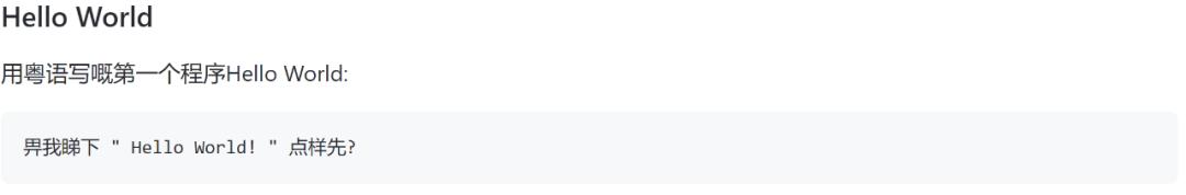 下面列举了粤语版「Hello World」以及一些基本的功能(循环、函数等),还涵盖了面向对象编程和堆栈使用的示例。当然,还有各种有趣的编程语法细节,比如用「搞掂」来结束函数,用「使下」来调用库。