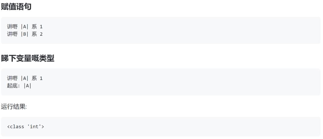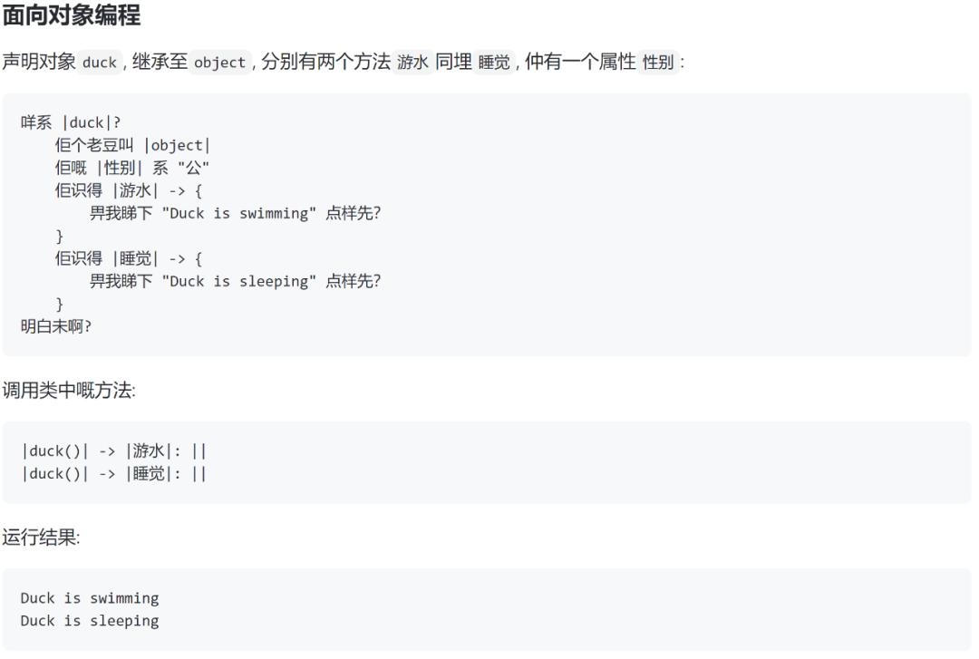 没想到吧,居然还能进行面向对象编程。「佢」的意思是「它」,代指一个对象;「佢嘅」意思是「它的」,能够用来构造属性;「佢识得」意思是「它会」,用来构造类的方法;「老豆」就是「爹」的意思,用于描述继承关系。最后用「明白未啊」做结束语问计算机你明白了吗,会让计算机倍感亲切,接受介绍给它的对象。