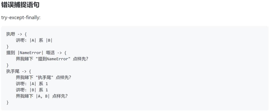 「执嘢...... 揾到...... 执手尾」对应着 try、except、finally。「执嘢」是收拾房间的意思,「揾到」是指收拾中找到破烂了,至于「执手尾」,就是选择丢不丢这个破烂了。