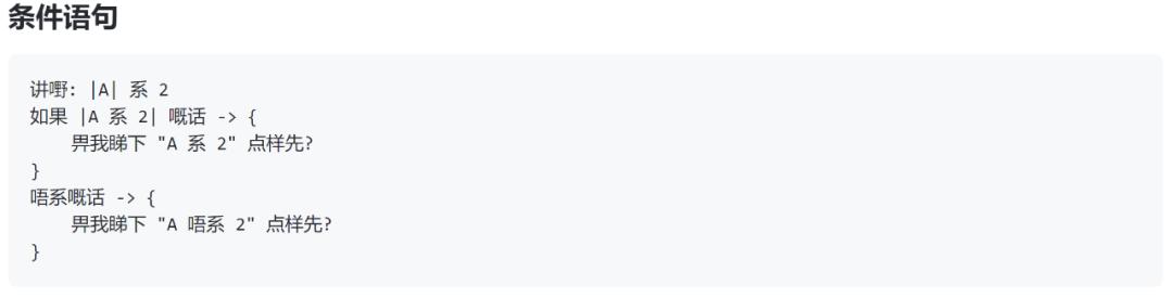 而赋值语句「讲嘢 |A| 系 1」的「讲嘢」是「说话」的意思,「係」就是「是」的意思。作者表示,编程时写「系」也是能运行的。同样的,「唔係」就是「不是」的意思,「定係」就是「还是」的意思。