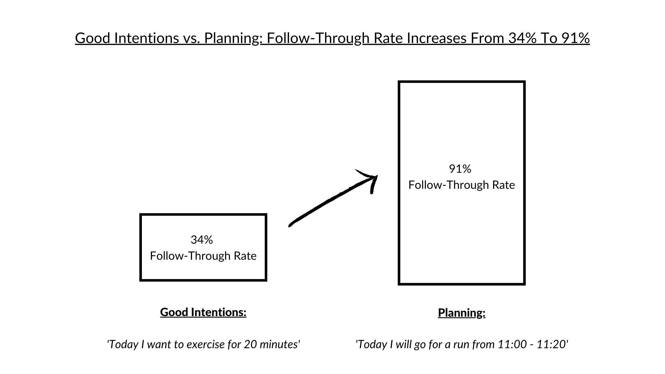 这就意味着,如果你把良好的意愿转化为具体的行动计划,那么你做这件事的可能性就会增加3倍。对于一个相对简单的习惯来说,这是一个很大的提升。正如他们所说,计划可以避免糟糕的表现。