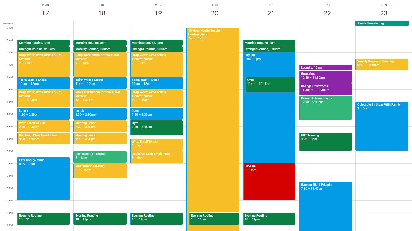 有时人们问我,时间分块是否会让生活方式变得像机器人一样。根据我的经验,事实正好相反。正是因为我对每一天都做了非常详细的计划,所以我能更快地完成我的工作,相比那些没有计划的人,我每天至少有1-2个小时的额外空闲时间。我越是安排好我的“工作”时间,我就越有更多的“休息”时间。