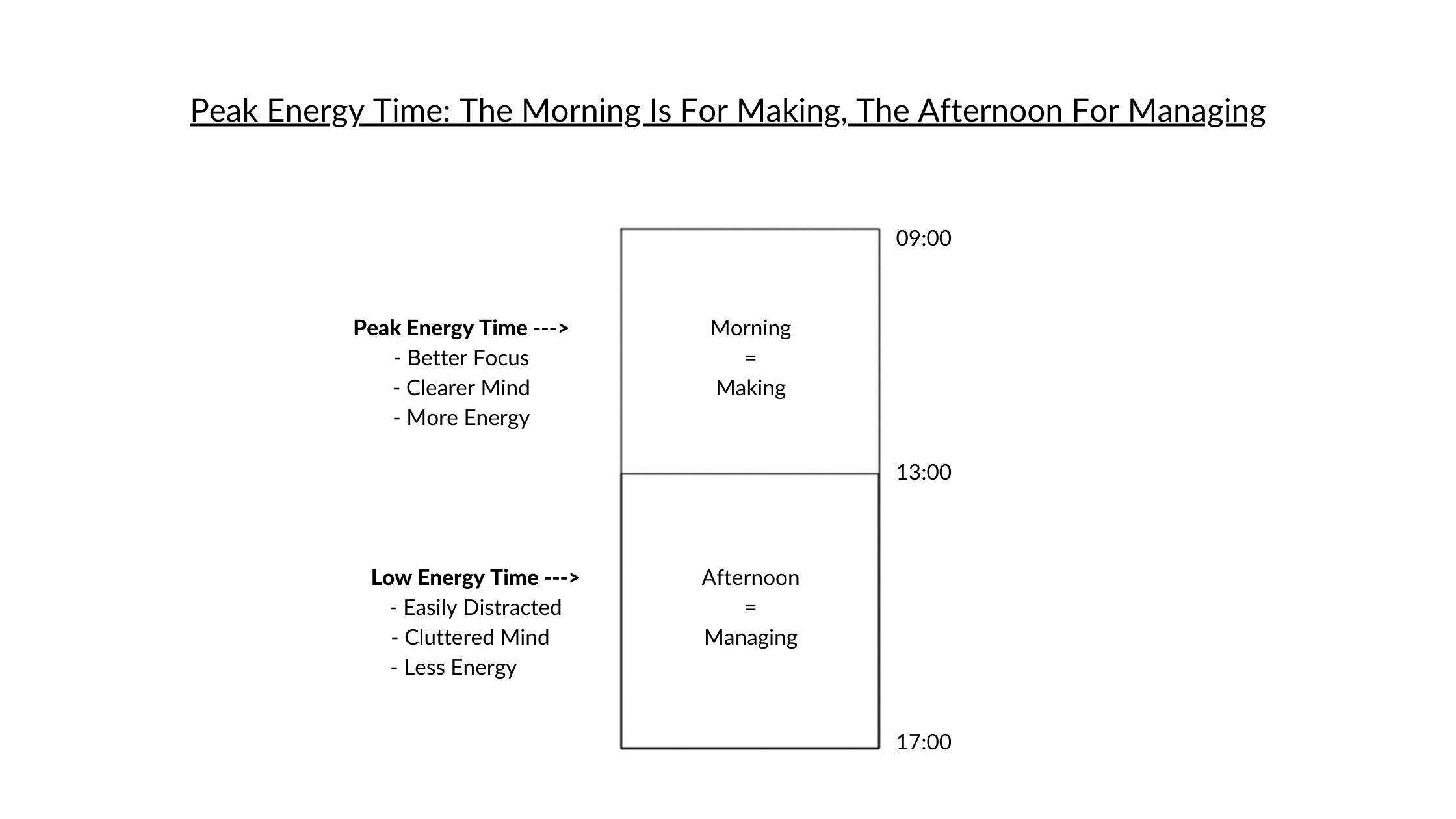 下午,我执行管理类任务,如电子邮件、回复评论、开会和完成行政工作。这些任务对我的认知能力或精力要求不高,它们甚至可以在次优状态下完成。毕竟,用一天中效率最高的时间去做这些低影响、低努力的任务是很可惜的。