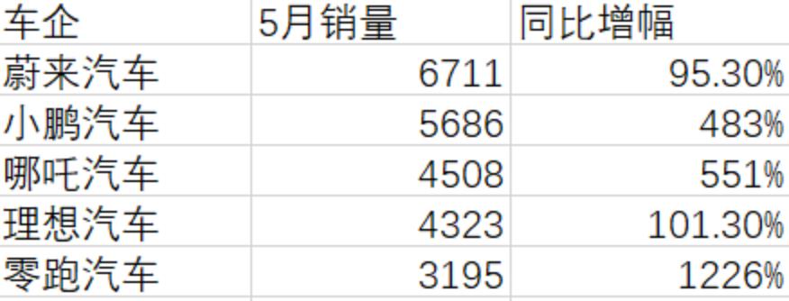 1-5月,哪吒汽车的累计销量为15996辆。虽然总量低于“蔚小理”,但5月的增速高达551%,位列新势力第一。