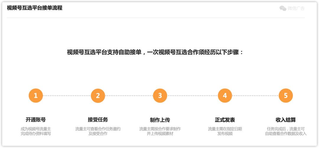 这一次,在视频号互选平台上如果想完成一单内容合作,一共需要5个步骤: