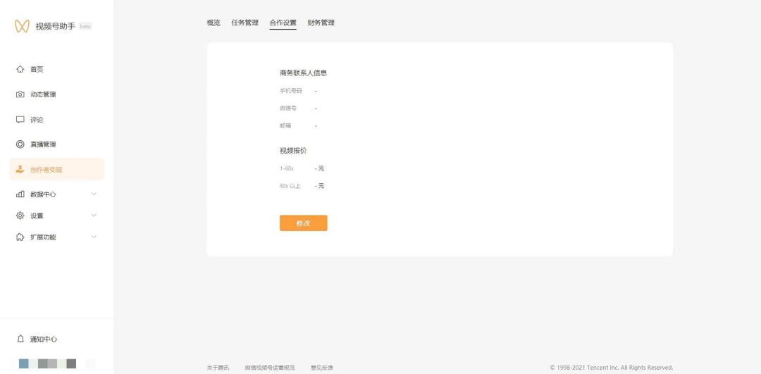 另一个完成“合作设置”,也就是填写商务联系人信息,以及1-60秒和60秒以上两种时长的视频报价。