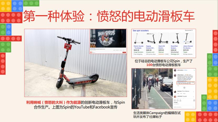 (1)The Rage Rider:愤怒的小鸟与Spin合作制作了100台特别定制的电动滑板车,将传统的驱动电门改为一只麦克风,通过使用者吼声的声音大小决定电动车的速度,驾驶者吼声越大,滑板车跑得越快,随后愤怒的小鸟将这些滑板车邮寄给各个媒体和网红,让滑板车的使用者体验到“愤怒”转化为“前进的动力”过程,通过大网红的开箱和体验极大的提升了活动的影响力。