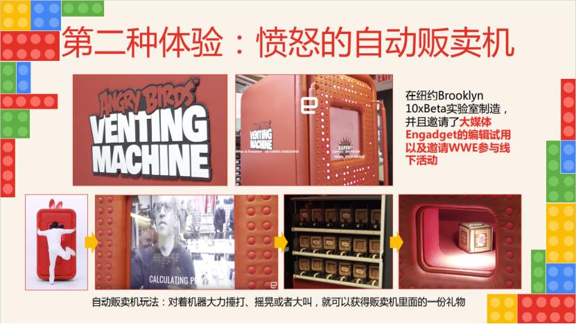 (2)The Venting Machine:愤怒的小鸟定制了只要击打就能掉出玩具的自动贩卖机并把它放置在了纽约的时代广场,现场邀请网红和WWE明星在线下体验并全程直播。体验者只要用力击打贩卖机,机器就能掉落各种小礼品,让“愤怒”转化为“获得奖品的喜悦”。无论活动现场还是线上直播都成功积累了大量的用户关注和互动。