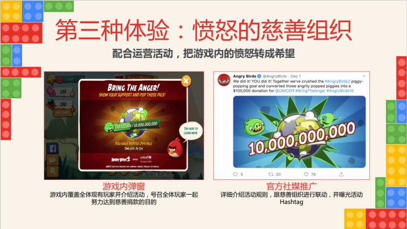 (3)Charity:借助慈善组织的口碑提升游戏的品牌形象。官方与慈善组织UNICEF联动,只要全球玩家达成100亿只piggy-popping的目标,愤怒的小鸟就会拿出10万美金作为慈善捐款。提供了玩家将“游戏中的愤怒值”转化为“实实在在的慈善捐款”的体验,在提升品牌影响力的同时,在社会公益上进行正能量传递,从而进一步获得用户的信任和好感。