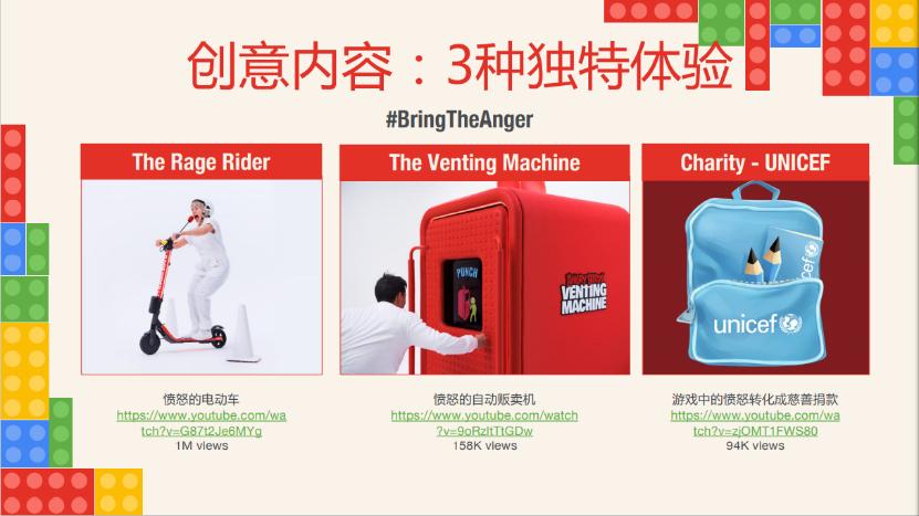 显然,无论是滑板车,还是玩具都是目标年龄段用户喜欢的创意和体验,最后的公益事业也是直接瞄准青少年。更重要的是,这三个体验不但兼顾了目标用户的喜好与传递愤怒这一品牌关键元素,更是通过了这三种独特的体验,展现了如何将愤怒这一相对负能量的情绪,转变为一种向上向善的力量。