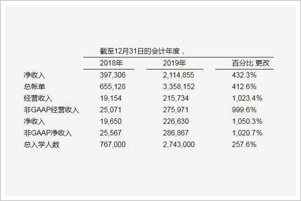 2019年6月6日,跟谁学在纽交所挂牌上市。当年财报显示,公司全年净收入为21.149亿元,同比增长432.3%;净利润收入为2.266亿元,同比增长1050.3%。