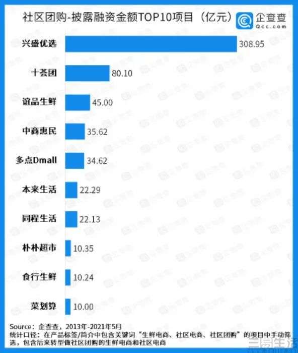 除此之外,在整个社区团购行业的融资状况中,也呈现出了头部平台“吸金”极为严重的情况。在企查查方面公布的2013年至2021年5月社区团购披露融资金额TOP10项目中,兴盛优选以308亿元遥遥领先,其次是十荟团的80亿元,以及谊品生鲜的45亿元。其中,背靠互联网巨头的同程生活(同程)、食享会(腾讯)、兴盛优选(腾讯)融资次数最多,均为8次,其次则是食行生鲜和十荟团,达到了7次。
