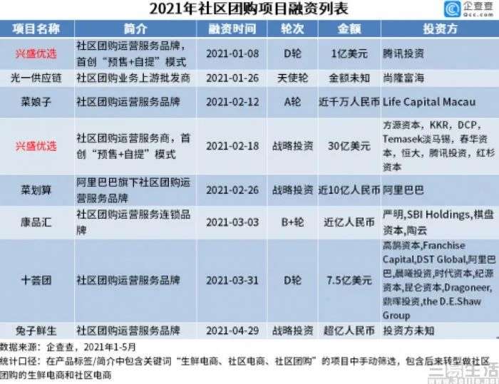 近日,企查查大数据研究院发布《2021上半年社区团购投融资数据报告》。其中显示,2021年1-5月,社区团购赛道仅8起融资,披露金额超262亿元,但资金已经集中涌向头部平台,其中例如“兴盛优选”在此期间的两次融资,金额高达31亿美元,“十荟团”也获得了7.5亿美元融资,仅两家企业的融资金额占比就已达到整个行业的95%以上。