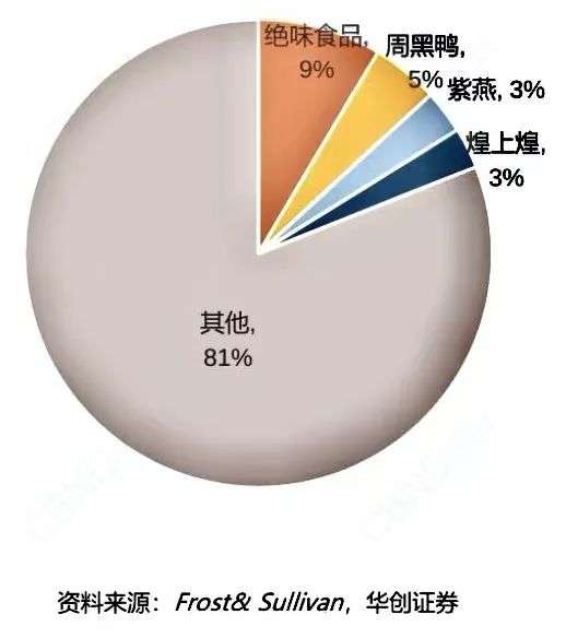 但另一方面,这个市场极度分散。绝味鸭脖、周黑鸭、煌上煌三巨头的累积份额,也不足20%,剩下八成的广袤市场,则被各种路边摊、夫妻店等单体卤味门店分食,这也给了新贵们上位的机会。