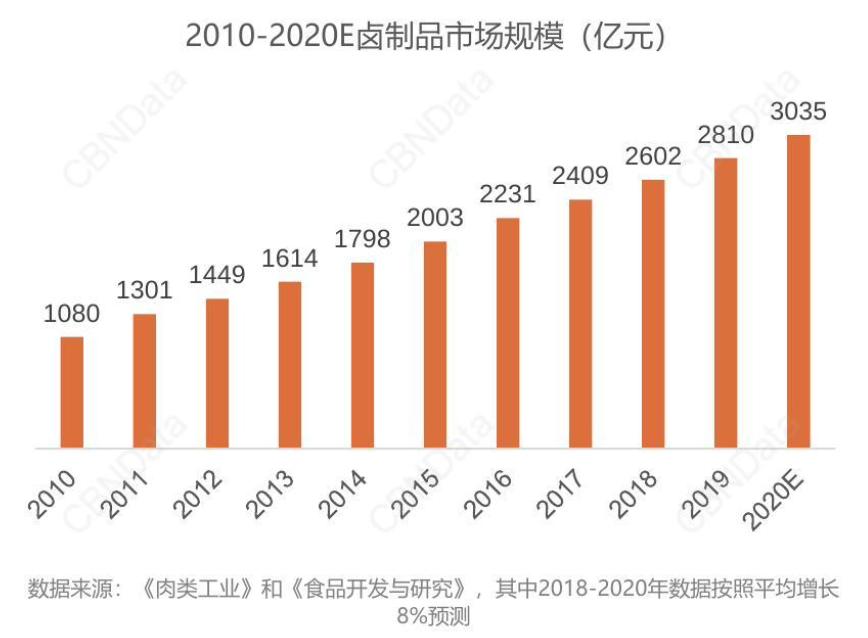 根据CBNData发布的报告,2020年卤味市场(包含佐餐卤制品、休闲卤制品)规模已突破3000亿元,年复合增长率达20%;另据弗诺斯沙利文的调研,2015-2020年,中国休闲卤制品复合增长率达24.1%,成为休闲食品中增速最快的品类。