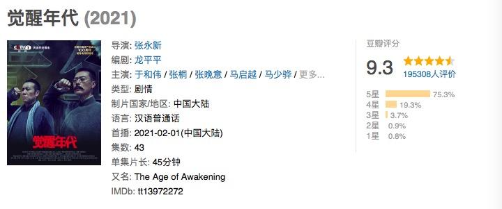 行业奖项、国民事件,《觉醒年代》显然是幸运的,一次次搭载东风而来,在娱乐信息泛滥的市场上完成了注意力抢占;而另一方面,这同样印证了其内容品质的优秀,才能经得起一轮轮的观众检验。目前超19万人在豆瓣上为该剧打下了9.3分的评分。