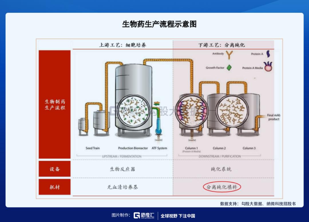 色谱技术广泛应用于医药制造、食品安全、环境监测、材料、石油化工等领域,以生物制药为例,色谱填料/层析介质微球是用于从生物发酵液中捕获、纯化目标生物活性成分的核心材料。分离纯化是单克隆抗体、融合蛋白、疫苗、胰岛素、多肽等生物药的核心生产环节,直接决定了药品的纯度和质量,也是主要生产成本所在。单克隆抗体生产中,下游分离纯化环节成本即占据整个生产成本的65%以上。