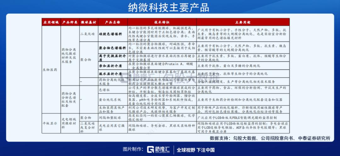 纳微科技创建于2007年,专注于高性能纳米微球材料的研发、规模化生产、销售及应用服务,主要产品包括用于生物医药领域的色谱填料和用于平板显示领域的间隔物微球等,服务对象包括生物医药、平板显示、分析检测及体外诊断等客户。
