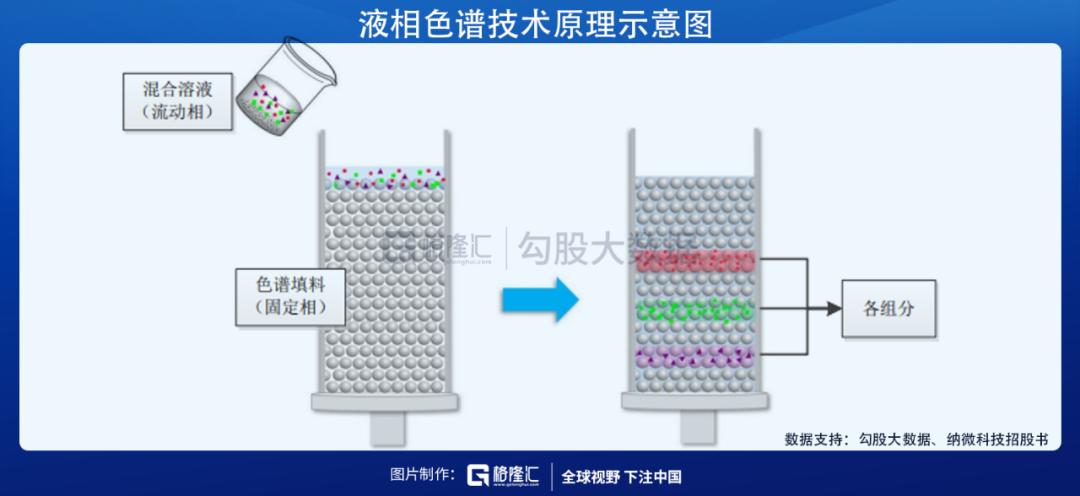 从原理来看,液相色谱技术以液体为流动相,当混合组分随着流动相从装有色谱填料的柱子一头进入、向另一端流动时,各成分物质因理化性质、与色谱填料作用力不同而具有不同的迁移速度,最终各组分按顺序从柱子另外一端流出而被分离。