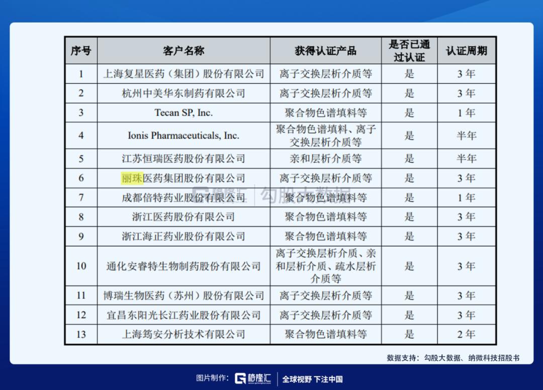 公司产品已获多家生物医药企业客户内部认证,相关主要客户具体情况如下: