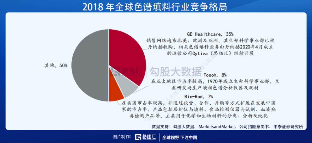 从竞争格局来看,全球市场长期被少数国际大型科技公司垄断,体现了行业的高准入门槛。 根据 MarketsandMarket 的市场数据,2018 年全球色谱填料行业 TOP3为 GE Healthcare、Tosoh、Bio-Rad,其市占率分别为 35%、8%、7%, CR3 达 50%,此外还包括 Merck、Danaher、Agilent 等。