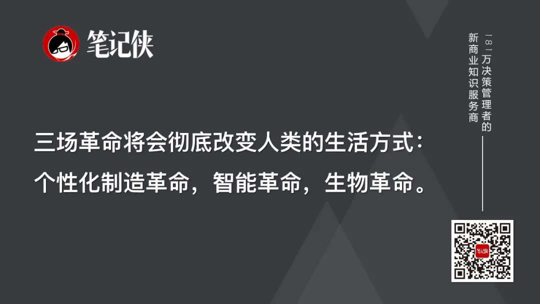 个性化制造革命:3D技术的普及,让每个普通人都能掌握设计、制造各种材料的能力,假以时日,食品、药品甚至人类器官,都可以通过3D打印实现;智能革命:机器人、驾驶自动化、虚拟实体将逐渐占据现有的人类就业岗位,计算机开始模仿人类的部分语言和思维能力,人类也在计算机的相互学习中得到提升;生物革命:人类将破解自己及其他生物的基因、遗传密码, 赢得对自身及其他物种的生物控制力,并施加干预与影响(当然,上述革命还会涉及到伦理问题)。