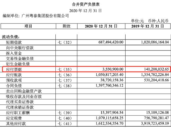 年报显示,截至2019年底,粤泰股份应付票据达1.41亿元;而到2020年底,粤泰股份应付票据余额降至355.09万元。其解释称是因为承兑及协商解决商业承兑汇票导致的应付票据减少。