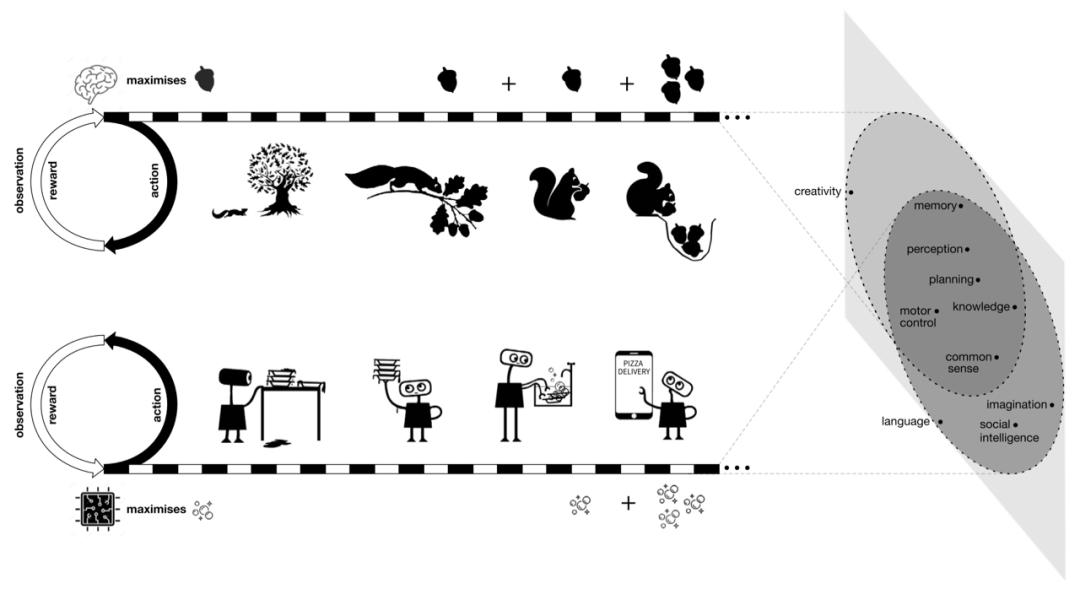 不同形式的智能源于不同环境中不同奖励信号的最大化。例如蝙蝠的回声定位或黑猩猩的工具使用等。