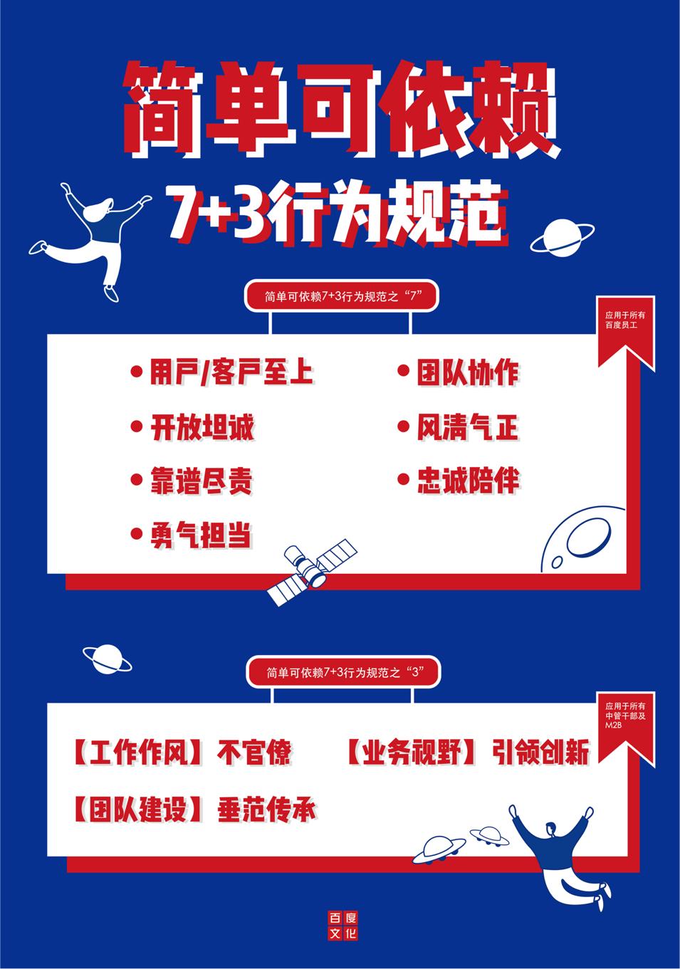 2018年,百度出台“文化七条”,通过7个维度把“简单可依赖”的内涵范围给框定下来。2020年,百度对“文化七条”给出可评价的行为规范,同时还针对管理者添加了3个维度,把“文化七条”正式升级为“简单可依赖7+3行为规范”。