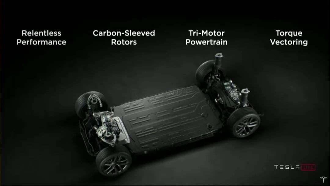全新的碳套筒转子保护套和三电机系统提供了性能保障,再加上软件方面的矢量扭矩控制,共同构成了强大动力输出的基础,值得注意的是,现场测试车的贴纸显示,Plaid采用了三永磁电机的架构,这是特斯拉多电机车型第一次摆脱了之前“感应+永磁电机”的排列方式。