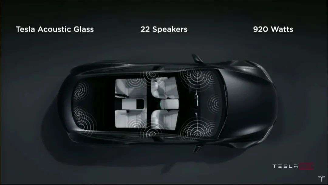 920瓦、22个扬声器的音响系统提供了更跨一级的影音娱乐体验,这里再次呼应了前述重点,出现了特斯拉自有品牌的隔音玻璃。