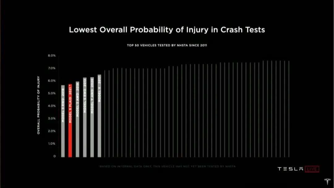 但之后,马斯克就用一句“同一辆车,比所有保时捷都快,比所有沃尔沃都安全”点燃了全场,不用说,又开始介绍安全了。