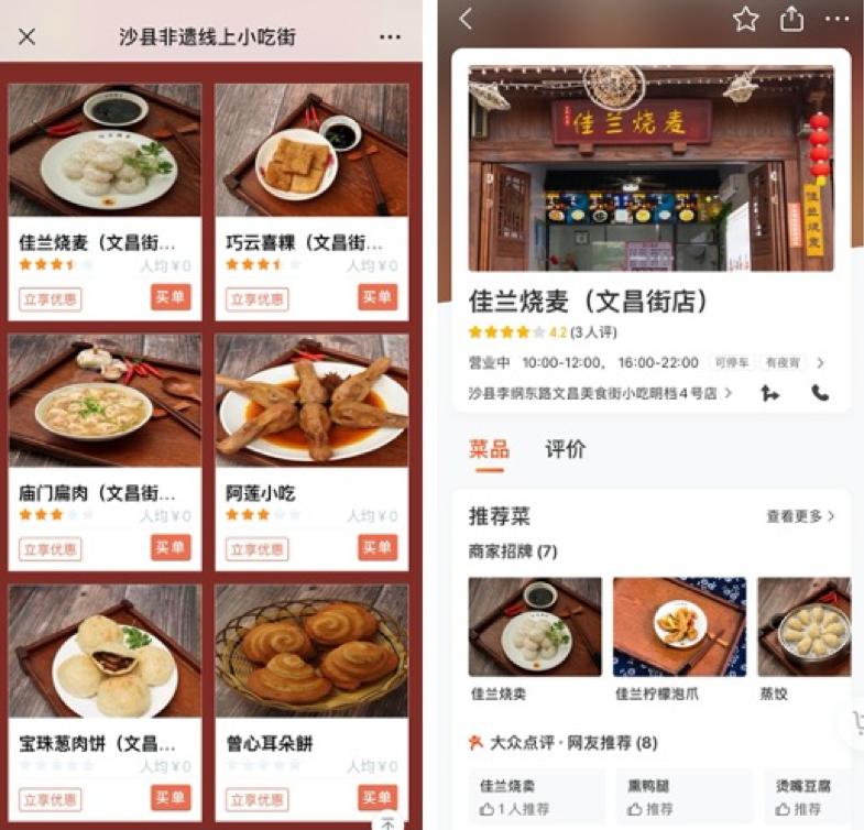 数字化时代下,非遗技艺面临传承与发展的双重课题。通过把非遗传统技艺小吃商户搬到互联网上,全国各地的消费者都可以通过美团App和大众点评App浏览线上门店、了解沙县非遗美食和技艺,甚至在前往当地旅游时帮助消费决策。目前,文昌街上的夏茂豆腐丸、木清泥鳅粉干、其云灯盏糕等商户也已相继推出外卖服务。