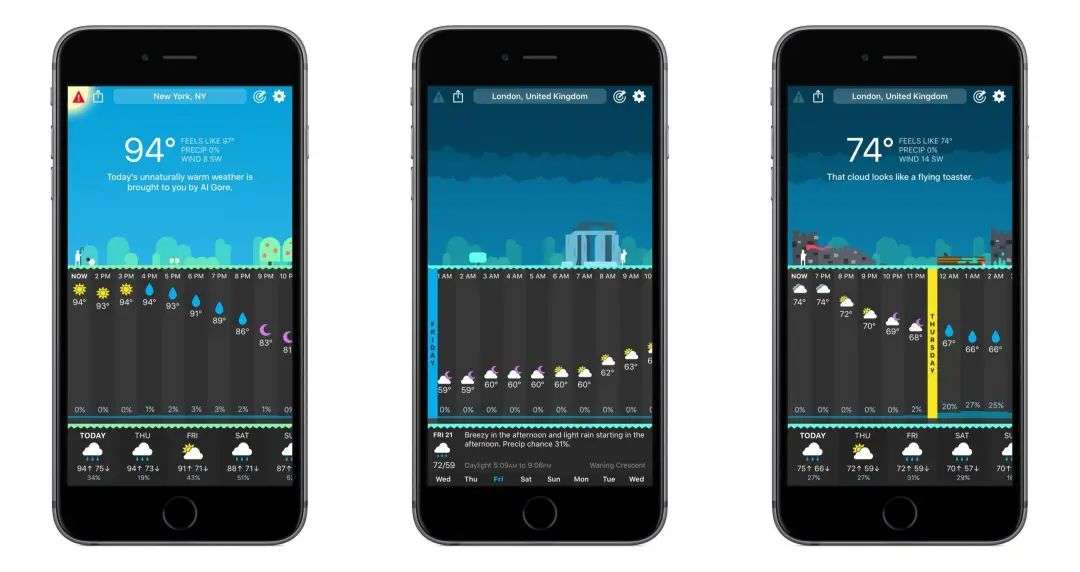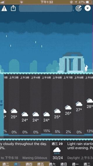 一个界面里,就涵盖了所有天气信息:上层是天空、气温、体感温度、降雨概率、风速,下层是按小时预测的天气信息和未来天气情况。