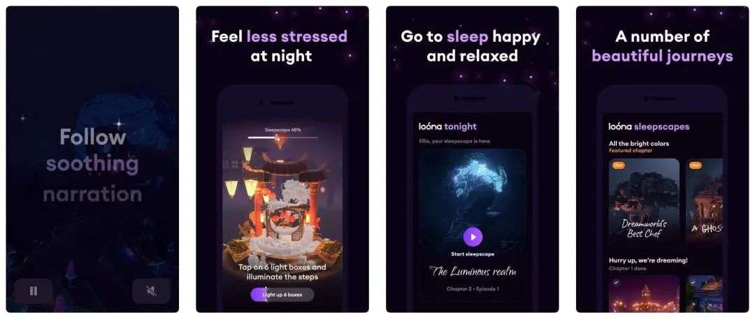 每晚这个 app 都会提供一个新的睡眠场景,就像一个疗程一般,结合令人心情放松的活动、故事、舒缓音效,让人们进入它打造的独特睡前「世界」。