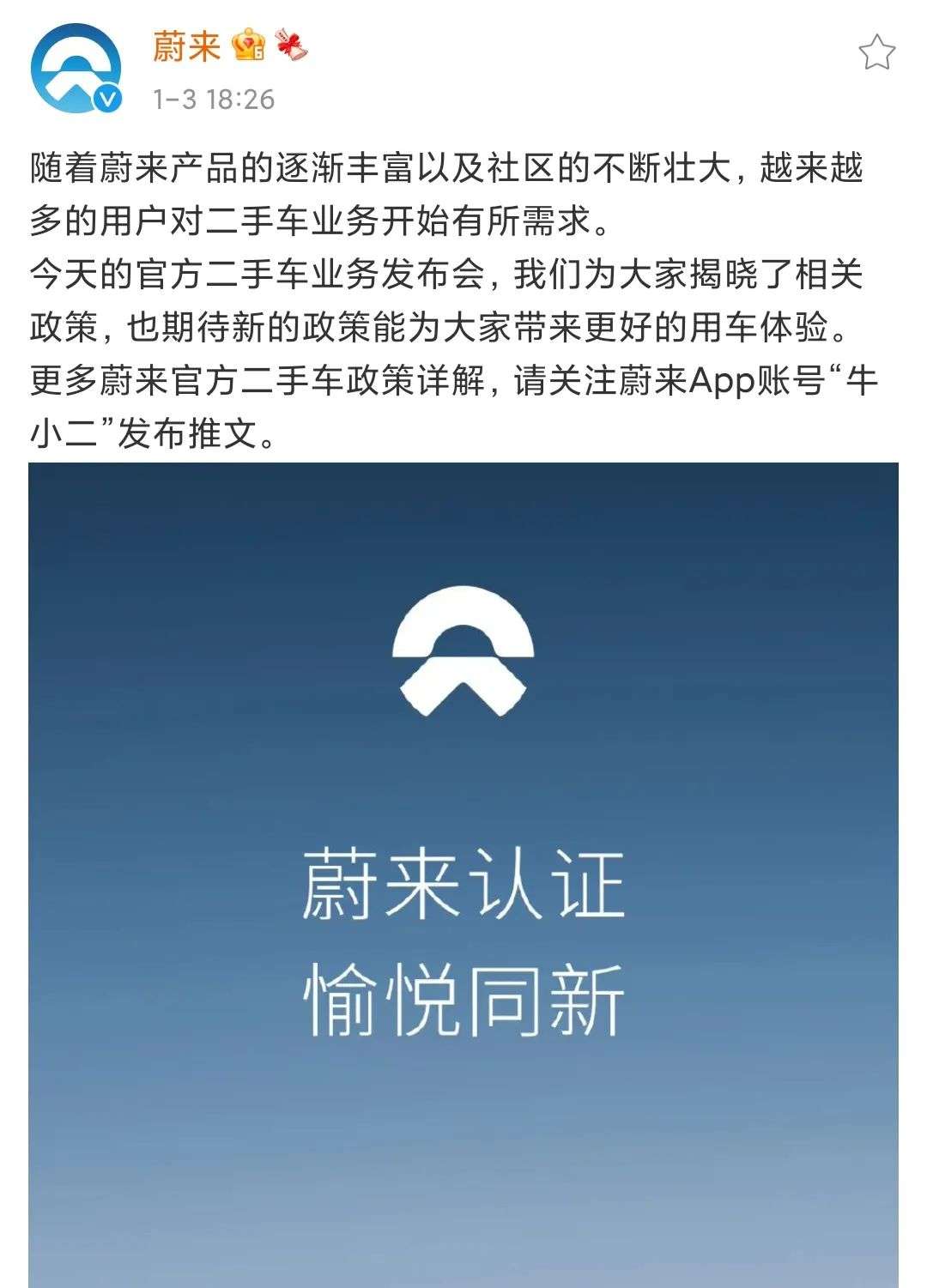 今年初,蔚来推出了官方二手车业务NIO Certified,根据其介绍,蔚来会通过自营方式运营二手车业务,为用户提供车辆检测、评估、收购、售卖等全流程服务。