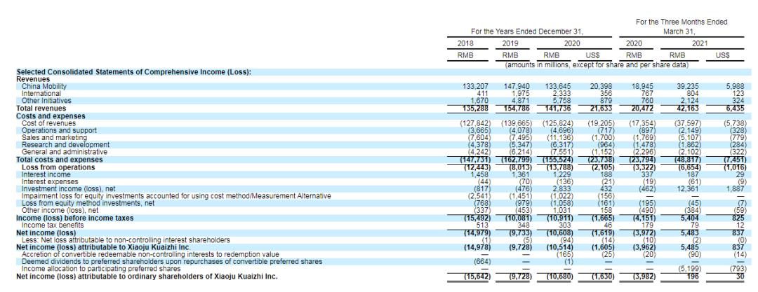 业务拓展期的滴滴出行处于亏损状态,2018年至2020年的净亏损分别为149.79亿元、97.33亿元和106.08亿元;而在2021年一季度滴滴扭亏为盈,实现54.83亿元的净利润。