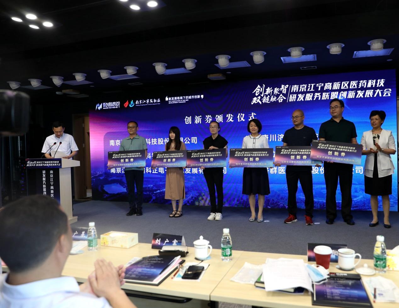 今年5月,江宁高新区医药科技研发服务联盟面向江宁高新区全体中小微企业开展创新券申报试行工作。当天会上举行了创新劵颁发仪式,江宁高新区12家生物医药企业获得创新劵,通过该劵可以购买医药科技研发服务联盟成员单位的检验检测、技术认证、资质认证、技术转让、知识产权,以及开放科研设施和仪器设备服务。海融医药、逸夫医院临床中心等江宁高新区3家医药单位代表作了交流发言,介绍行业热点和各自情况,畅谈如何借助医药科技研发服务联盟实现更好发展。
